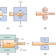 Penempaan bekerja secara mekanis atau merusak satu bagian dari logam yang biasanya panas; hal ini dapat dicapai dengan penerapan pukulan berturut-turut atau dengan meremas terus menerus. Tempa diklasifikasikan sebagai die (cetakan) tertutup atau terbuka. Untuk die tertutup, gaya dibawa untuk menanggung dua atau lebih bagian die yang memiliki bentuk jadi sehingga logam berubah bentuk di rongga di antara mereka (Gambar 2a). Untuk die terbuka, dua die memiliki sederhana geometris bentuk (misalnya, paralel datar, setengah lingkaran) digunakan, biasanya pada benda kerja. Benda tempa memiliki struktur butir yang luar biasa dan kombinasi sifat mekanis terbaik. Kunci pas, poros engkol otomotif, dan batang penghubung piston adalah benda khas yang dibentuk menggunakan teknik ini.