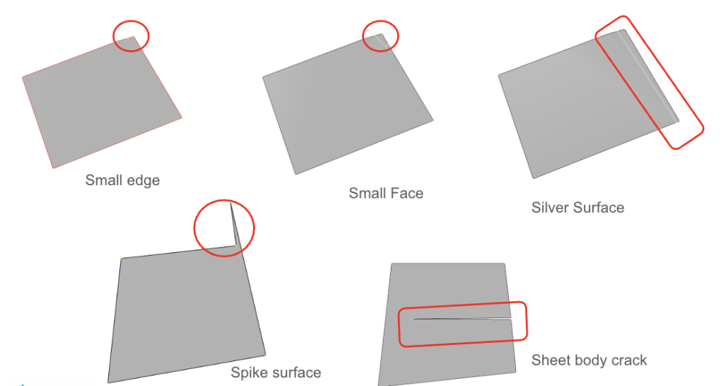 Cacat lainnya adalah sliver surface (sering disebut silver surface), yaitu permukaan tipis memanjang dengan rasio aspek yang sangat tinggi. Permukaan ini biasanya muncul akibat operasi CAD seperti trimming atau intersect yang tidak sempurna. Sliver surface dapat menyebabkan kualitas mesh menjadi buruk karena menghasilkan elemen dengan bentuk yang sangat tidak ideal. Selain itu, terdapat juga spike surface, yaitu tonjolan kecil yang tidak realistis secara fisik dan dapat menyebabkan distorsi mesh lokal.