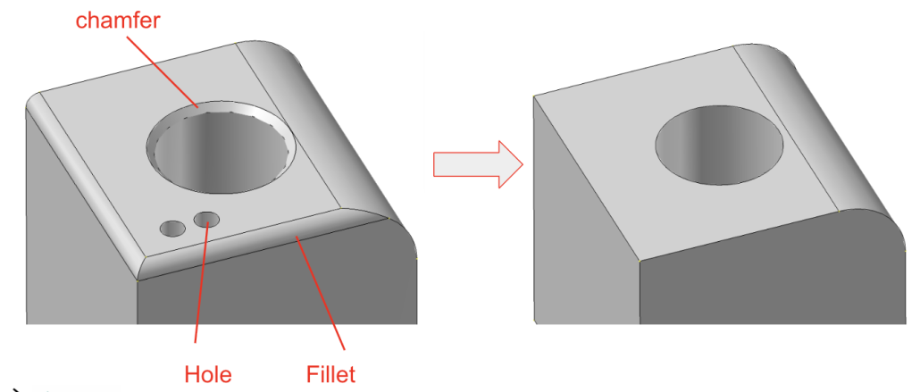 Selain menghilangkan cacat, proses clean up juga mencakup manipulasi fitur geometris seperti chamfer, hole, dan fillet. Fitur-fitur ini sering kali perlu disederhanakan tergantung pada tujuan simulasi. Chamfer dan fillet kecil yang tidak berpengaruh signifikan terhadap distribusi tegangan dapat dihapus untuk mengurangi kompleksitas mesh. Namun, pada area kritis seperti konsentrasi tegangan, fillet justru harus dipertahankan karena berpengaruh terhadap hasil analisis.